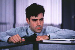 »Clockwatchers« was about the lowest rung on the employment ladder--daily temps--but OFFICE SPACE suggests that regular employment is even worse, because it's a life sentence. Asked to describe his state of mind to the therapist, Peter says, »Since I started working, every single day has been worse than the day before, so that every day you see me is the worst day of my life.«